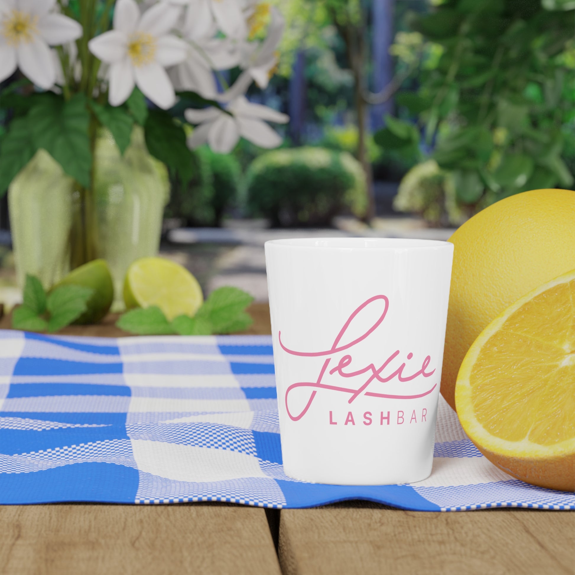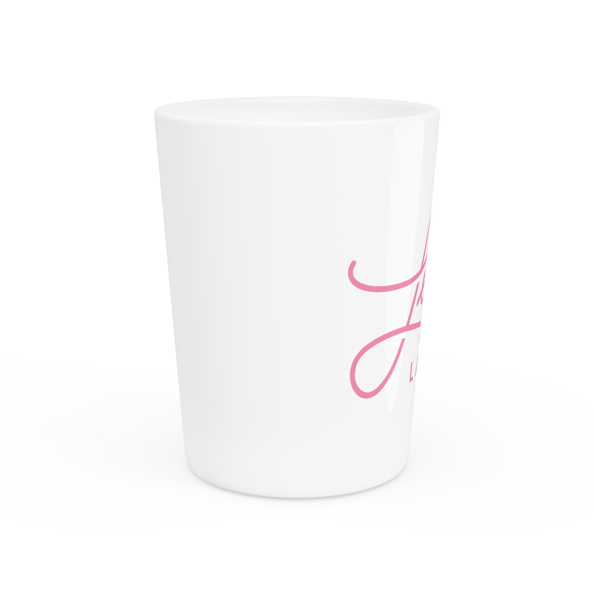 A glossy white ceramic 1.9 oz shot glass printed with a soft pink, hand-lettered logo — small but full of personality. It brings a touch of boutique charm to lash artists’ celebrations, client milestones, or studio shelf styling. Lightweight and sturdy, the cup wears vibrant color that resists fading and stands up to dishwasher cycles, so the logo stays fresh through everyday use. Choose white or a black interior to match your studio aesthetic. Sold individually.